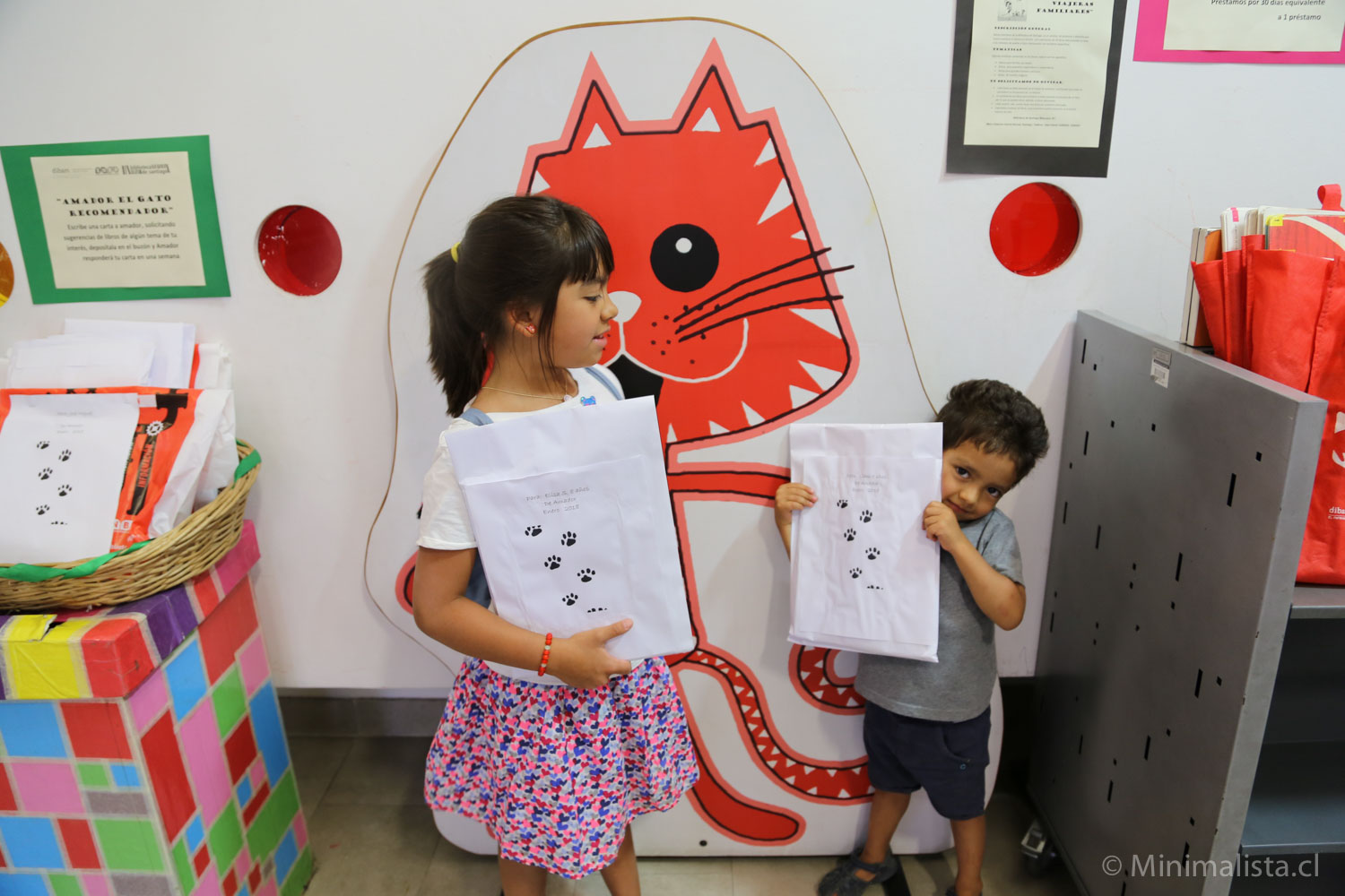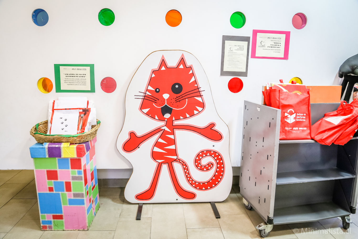 A la entrada encontramos a Amador, el gato recomendador y bolsas viajeras que contienen un grupo de libros que tienen el mismo tema (los animales, el cuerpo humano, etc).