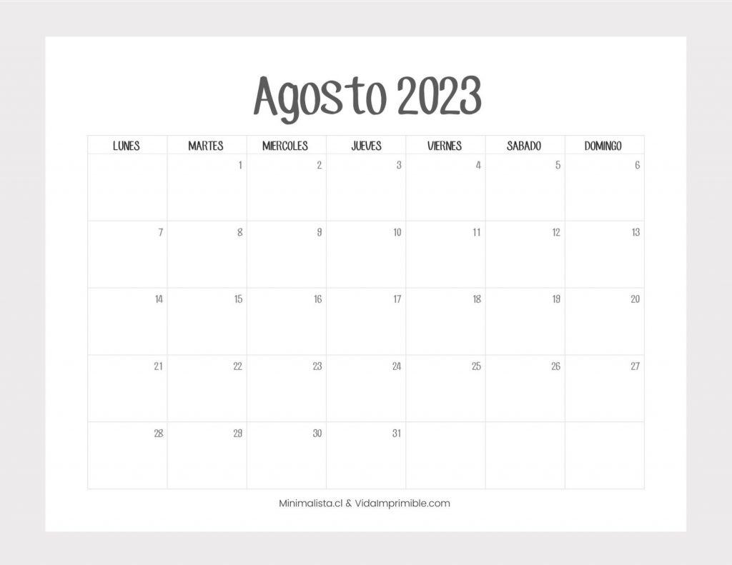 Calendario Agosto 2023 para Imprimir Descarga Gratis