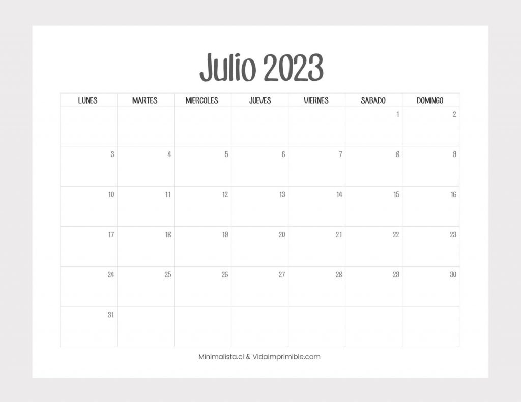 Calendario Julio 2023 para Imprimir Descarga Gratis