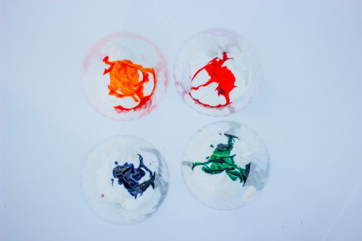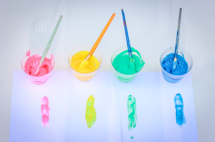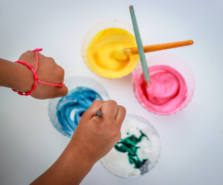 Para cada color mezcla media 1/4 de taza de yogur con 6 gotitas de colorante de comida. Haz cada mezcla en un vaso distinto y pon un pincel en cada vaso.