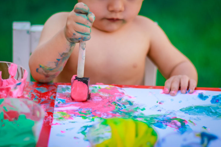 Nosotros hicimos esta actividad cuando Liam era verano y Liam pintó afuera en el paso en pañales. Le encantó y aunque le dije que la pintura no se comía (tenía miedo que si lo dejaba comer iba a probar todas las pinturas que le pasara en el futuro) estaba tranquila porque si se le ocurría ponerla en su boca, sabía que era seguro para él.