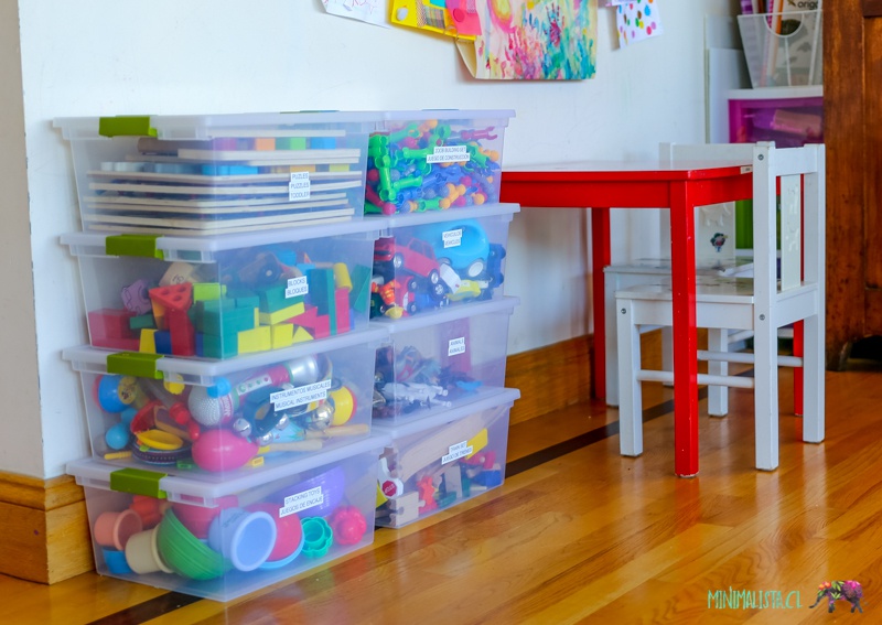 Me hubiese encantado tener una pieza de juegos y ordenarla con repisas y bandejas con distintos juegos/actividades, pero no tenemos una pieza extra y al final todos los juguetes de Liam estaban en el living de nuestra casa!