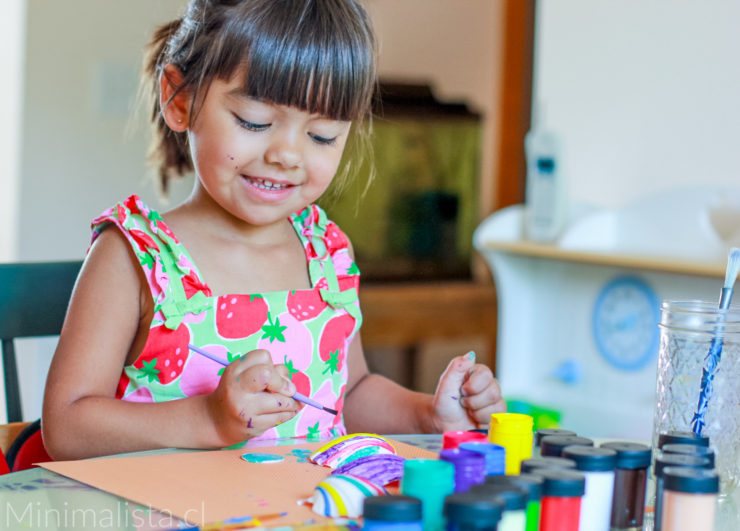 Las pinturas pueden ser témperas o acrícilas, las segundas duran más tiempo y los colores son más brillantes pero son más difíciles de limpiar. Como pueden ver en las fotos, mi hija partió pintando con su vestido y unos minutos más tarde decidí ponerle delantal para proteger la ropa.