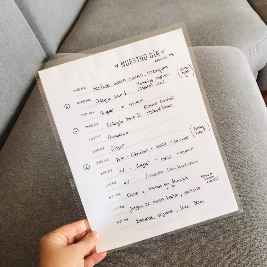 Estas 5 semanas han sido mejor de lo que me hubiese imaginado en términos de estar con los 3 niños encerrados en la casa. Las primeras semanas tratamos distintas cosas: no tener horario, que ellos hagan su horario diariamente y al final lo que mejor resultó fue tener el mismo horario establecido todos los días. Fuimos probando distintos horarios y finalmente establecimos uno que nos ha servido ya por semanas.