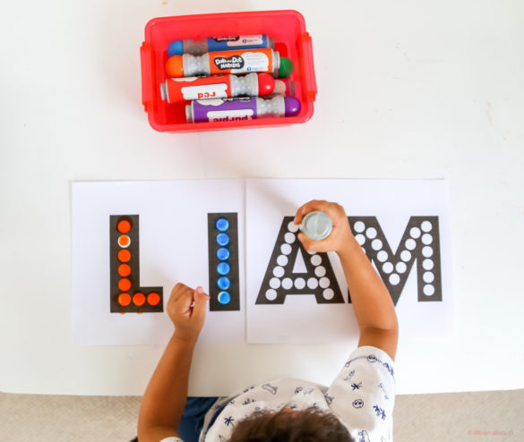 En las últimas semanas, Liam ha mostrado gran interés por escribir su nombre. Hemos trabajado en identificar las letras y buscamos las de su nombre en carteles, envases de comida y cualquier palabra que veamos por ahí. Aún no las identifica por nombre, pero las reconoce cuando las ve.